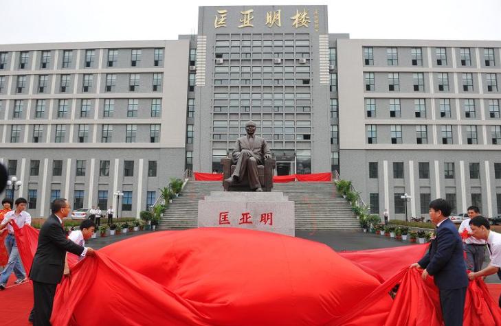 虽然天降细雨,但是8点左右,参加仪式的人员已经陆续到场,匡亚明楼前人头攒动。8时30分,仪式正式开始,党委书记陈德文和校长展涛共同为匡亚明楼揭幕,当巨大的红幕从匡亚明楼上缓缓滑落的时候,在场所有人鼓掌并持续良久。在刚刚揭幕的匡亚明楼前,匡亚明之子匡榕榕先生、校长展涛为匡亚明先生塑像揭幕,全体人员向塑像鞠躬致敬,并由学生代表为匡亚明塑像敬献花篮,以表达吉大人对匡亚明先生的缅怀与崇敬。
