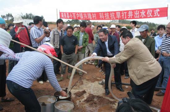 4月21日上午10点,在云南陆良县小百户镇兴隆村干裂的土地上,由吉大专家用核磁共振找水仪的探测打出的第一口井即将出水。兴隆村的数百名村民老老少少挑着扁担、赶着牛车兴奋地赶来取水。为了纪念科技抗旱、真情相助的难忘时刻,云南省科技厅举办了“科技抗旱成井交接仪式”。吉大党委副书记兼副校长韩晓峰率领由仪器科学与电气工程学院党委书记余国友和段清明教授,建设工程学院党委书记王爱民、副院长赵大军教授组成的专家组亲临现场,参加了这一重要仪式。